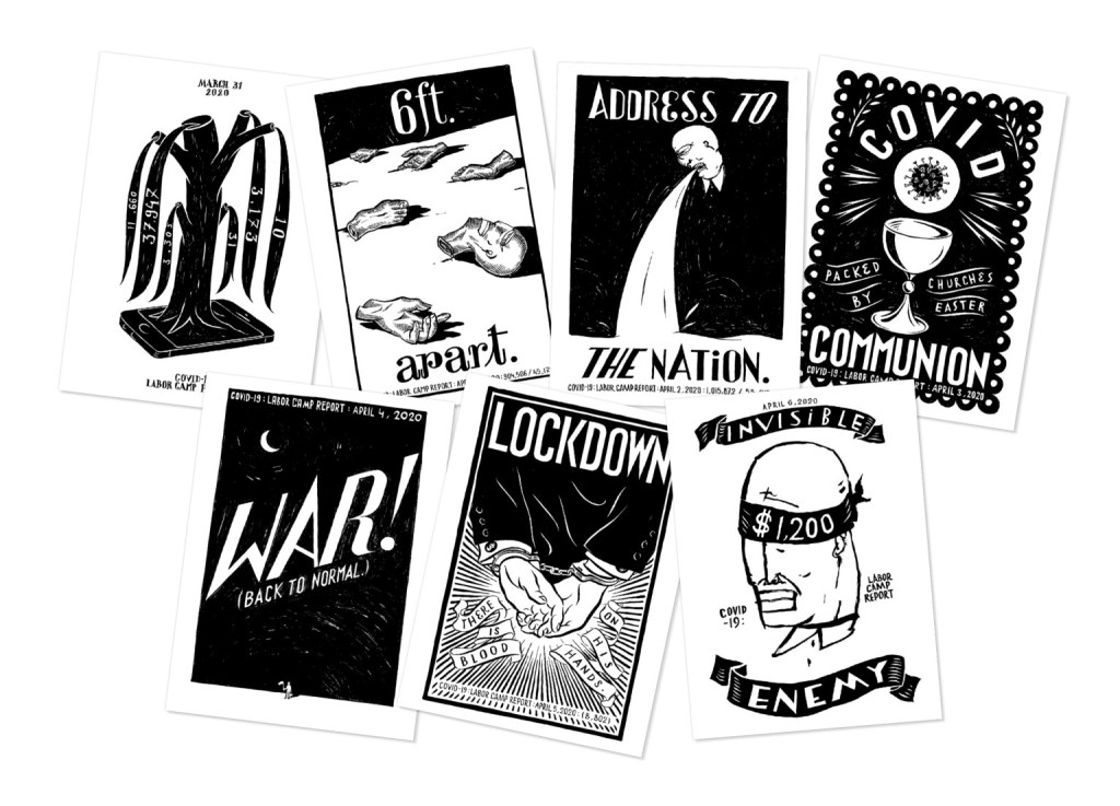For my last Omeka project (hopefully ever) I created this exhibit about artist Pitor Szyhalki’s COVID-19 Labor Camp Reports. Szyhalski created a broadside a day from March 24 to November 3, 2020, responding to the myriad crises America faced almost daily as the COVID-19 death rate soared in the run up to the 2020 presidential election.